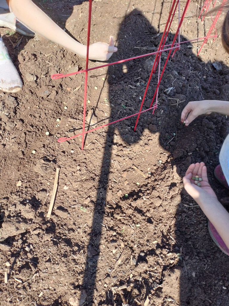 So on the same plot we are trying to grow sugar snaps once again, but we chose to directly sow them and are using a red collapsible trellis.