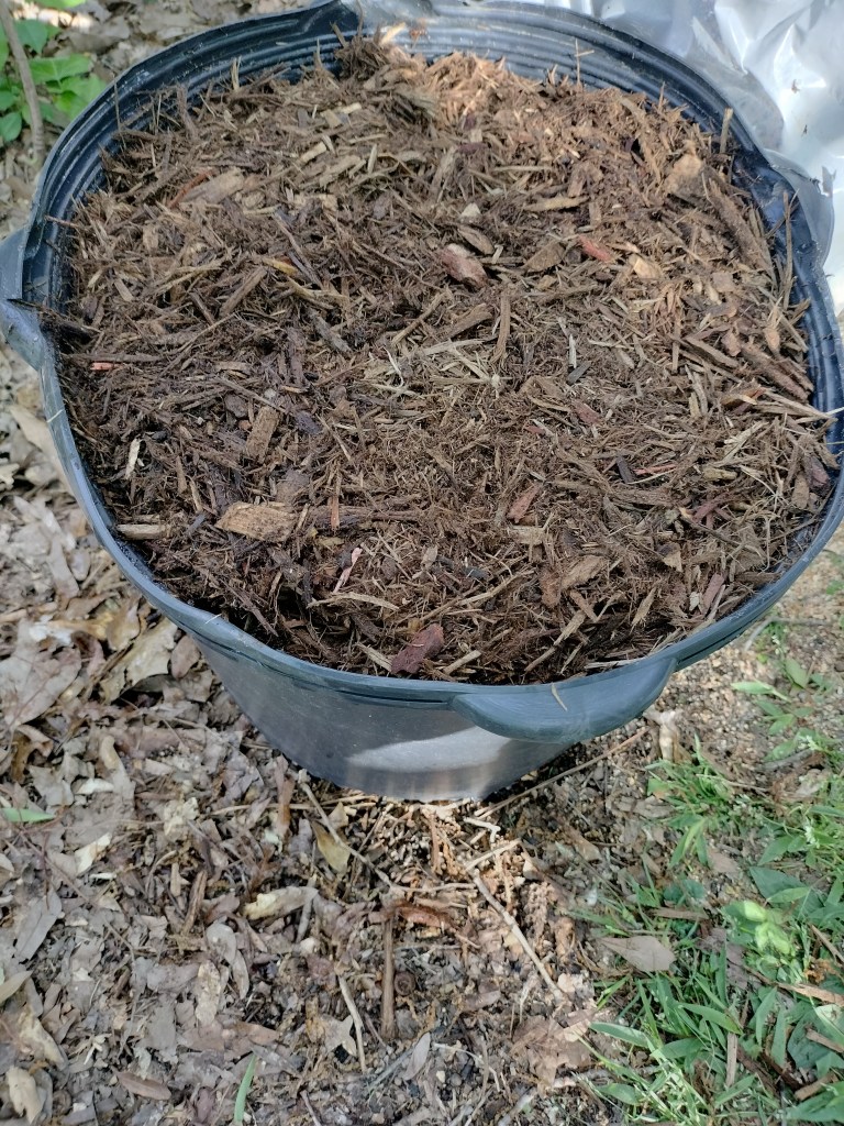 So, since we already knew how to do that with a bed, watching videos on growing potatoes in pots showed me that I could take a similar approach. I had a leftover 10 gallon pot from when my mother in law had brought a hydrangea down one year. I had been using it to store compost, but I used so much of the contents it felt time to repurpose it. See the pictures below: rotting wood, compost, soil, potatoes, more soil, and hardwood mulch. The total outlay was probably $5 between the potting soil and mulch because I already had the rotting wood, compost, and sprouting potatoes. Also, I can use the filled pot again and again after the potatoes are done.